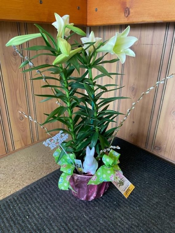 Double bloom plant easter lily. Decorated with pussy willows, easter decor and spring ribbons
